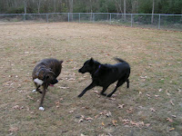 ths, Linda and Dick, have a 3 year old boxer named Raz, who has become fast friends with Abby. They have about the same energy level and have a blast. Linda also showed me a city dog park, located about half mile behind the campground, which I never knew existed the entire time we lived here. We walked the dogs over there last week before all the rain hit, and they had fun playing with some 6 month old pups. Mikey generally prefers to walk the perimeter and sniff everything he can, going on sensory overload!