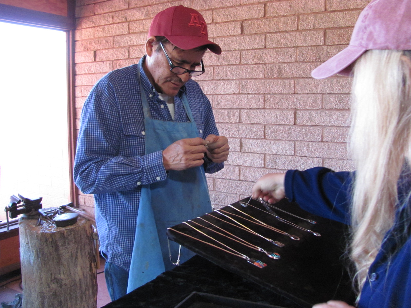 ajo woman weaving one of the many rugs that are sold over at the Post. We walked across the parking lot to the trading post which opens up into the grocery store and then breaks out into several rooms filled with handcrafted jewelry, rugs, and baskets along with all manner of items hanging from the rafters and lining the walls and shelves.
