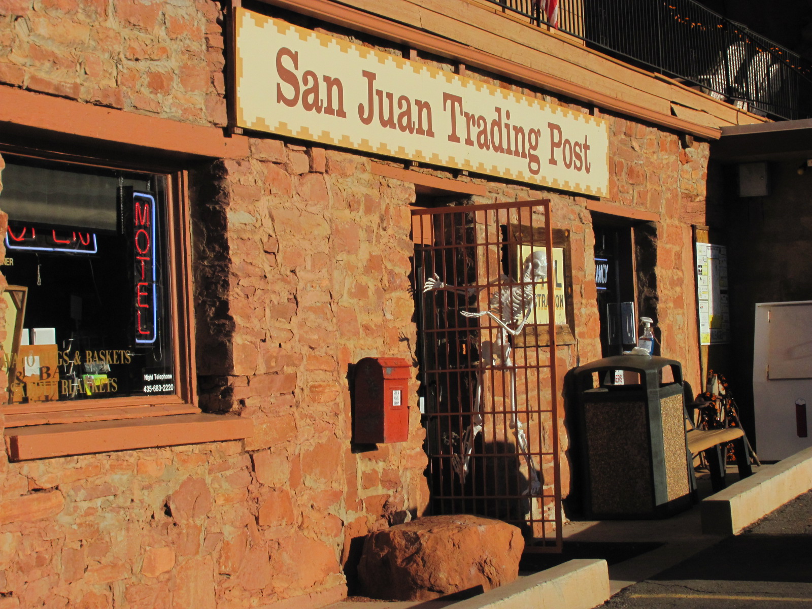 located next to the San Juan Inn & Trading Post. The menu is extensive and boasts a full Ranch Breakfast complete with eggs cooked any way you want for about $7, but if you want those eggs poached, it’ll cost you $20! Guess they don’t like to poach eggs. I chose the Southwest Green Chile Omelet that came with toast and potatoes and was more than enough food for me, and Russ decided on the Southwest Breakfast Burrito that was about as big as Russ’ arm and would have easily