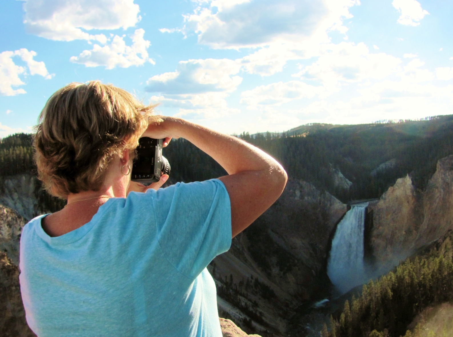 and the Canyon Village area deciding to save those stops for another day since we still had quite a ways to go. We drove up over Dunraven Pass at 8,859 feet where several cars were parked with people looking through spotting scopes. Turns out there were a black bear and her cubs eating nuts in a tree across the valley, and with Terri’s telephoto lens on her camera she got her first glimpse at black bears. We made several more stops along the way, and she was continually amazed at the beauty that surrounded her.