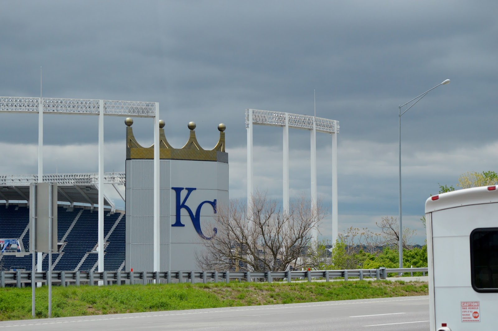 is closest to the highway and originally opened as Royals Stadium in 1973 but was renamed in 1993 in honor of the team’s founder, Ewing M. Kauffman.  Arrowhead Stadium opened in 1972.  I can never get a decent shot of the two together as we’re speeding down the interstate but have managed to get at least part of them separately.