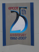 Having found out that Monday was the 25th anniversary of the opening of Epcot, we decided to extend our stay one more night so we could attend some of the festivities including the special IllumiNations production at the end of the evening. (Besides we still had 5 counter service and 3 snack credits to use!) We tooled around Epcot for a bit getting a retro guide map the park distributed and viewing the displays that had been put together in the exhibit hall reflecting Epcot's first 25 years. Below are some of the photos: