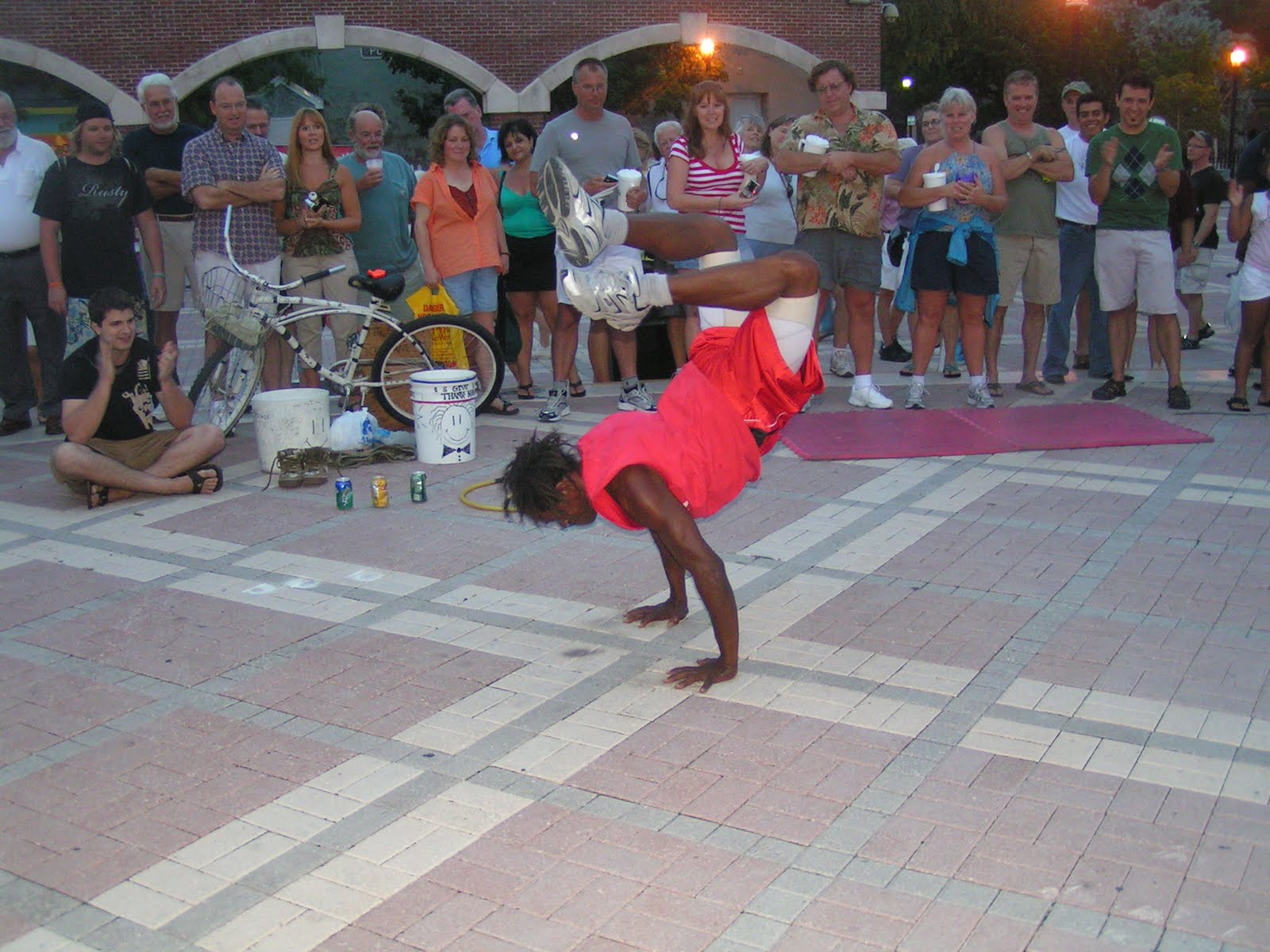 ntertaining. We didn’t get his name but he was funny soliciting for tips as he performed. As each act ends, they try to steer you towards the next performer, and next up was Dr. Juice, the Calypso Tumbler, who grabbed a couple volunteers from the audience as he performed his aerial acrobatics. The guy is 54 years old and as part of his act did 20 handstand pushups...and could have easily done even more! His final act was jumping through a hoop that was bein