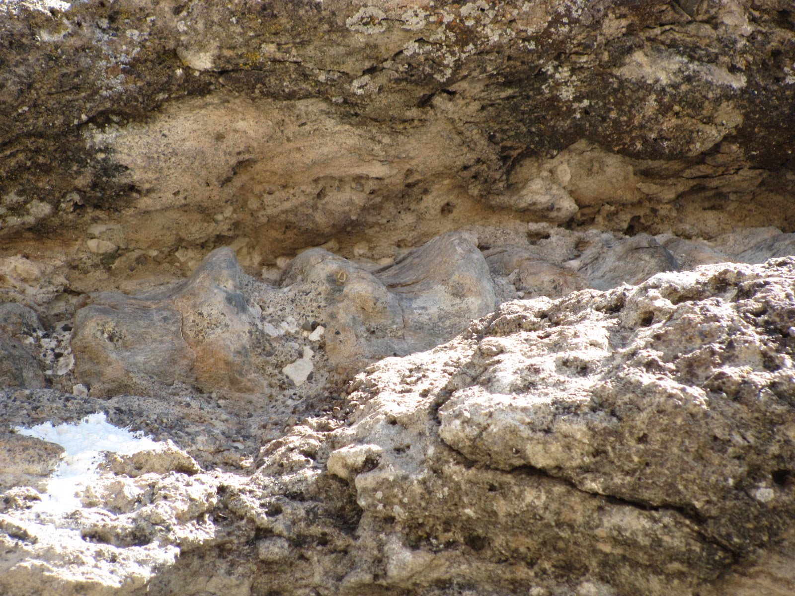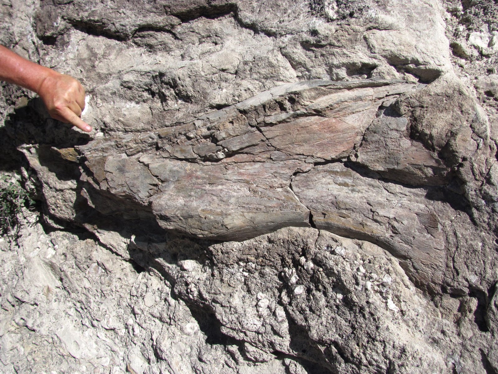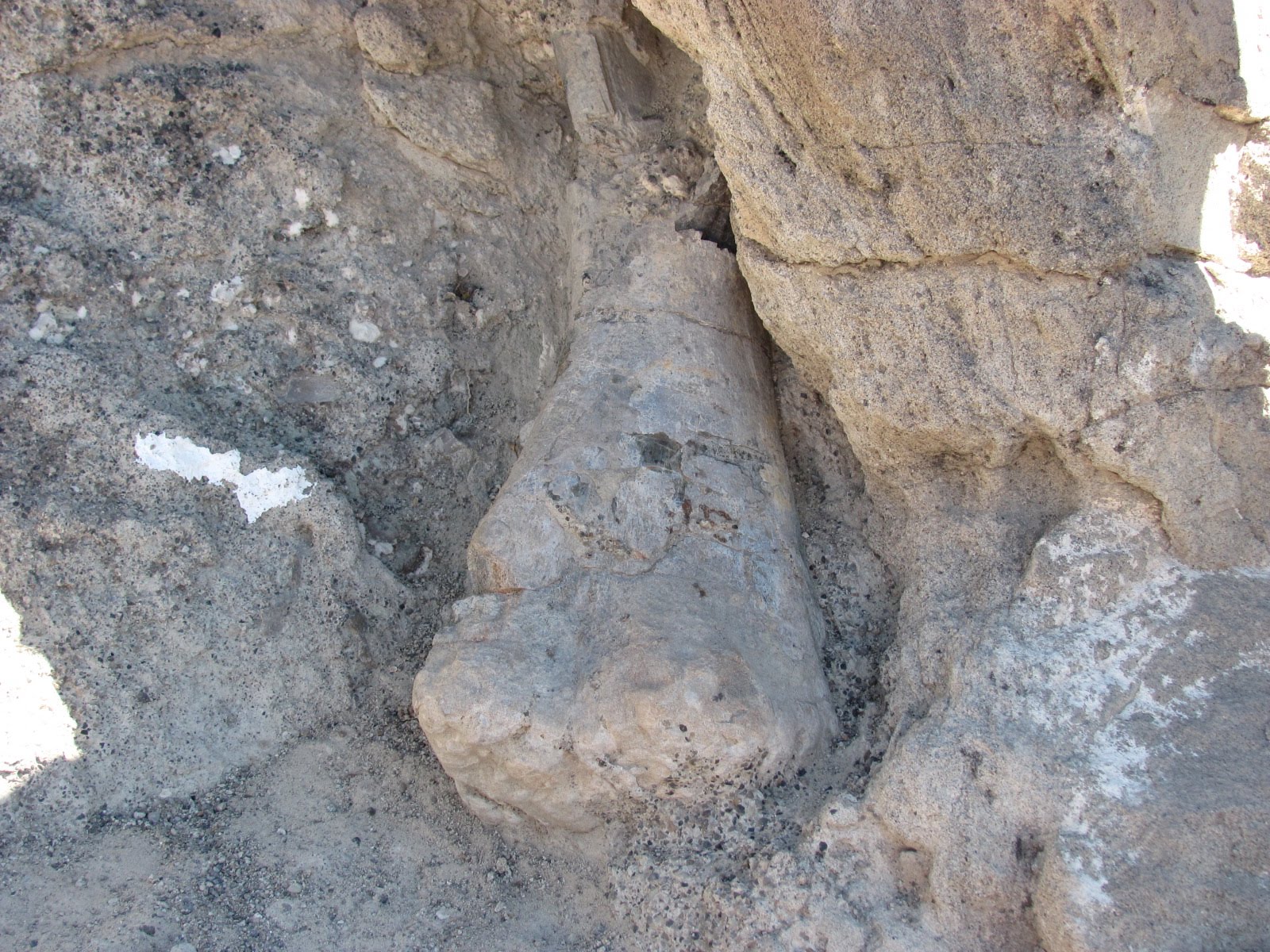 have passed right by bone fossils without realizing it. Most simply look like the rest of the rock, but a couple have a white arrow pointing them out like in the picture at left. At right is a vertebrae, and in the picture below left, Russ is pointing to