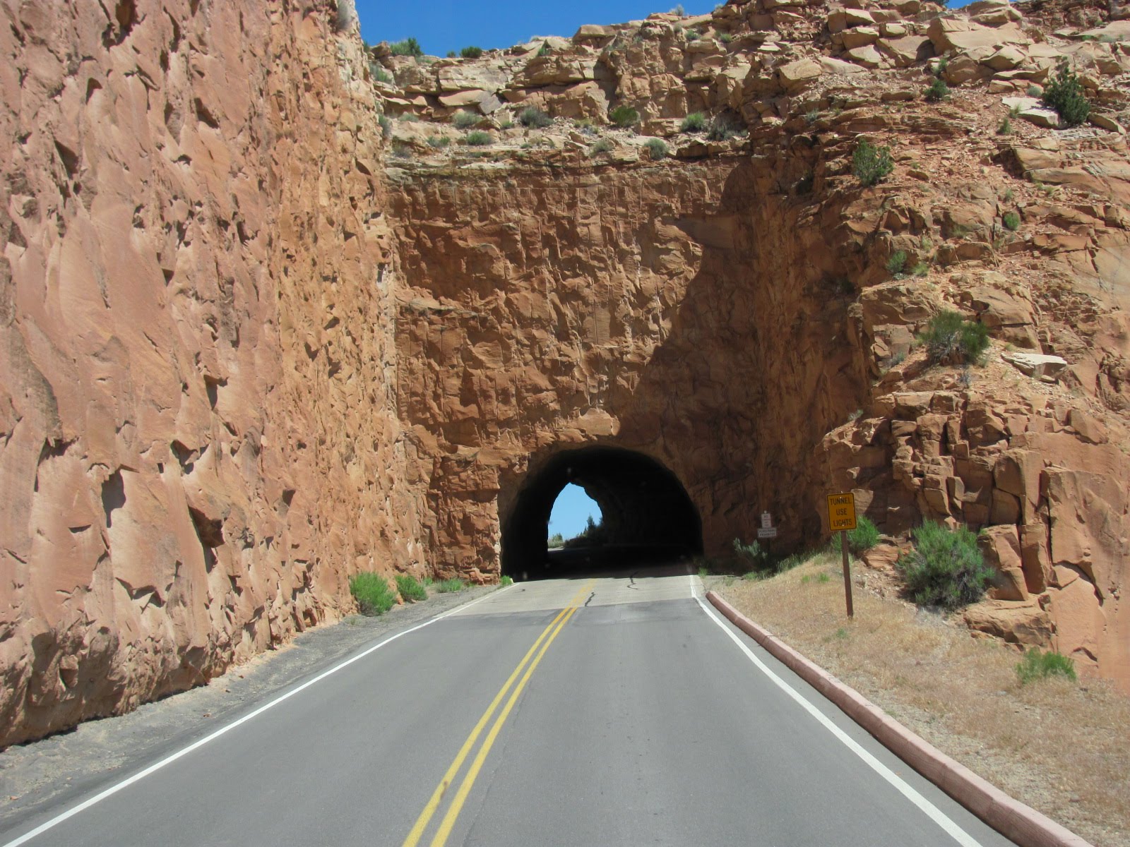 ately 1,100 feet, and the view at left is from close to the top looking back down the road. There are two tunnels on this section of the drive with a center height of 16’ but 11’5” near the edges. Our RV’s height is just under 13’ so to be safe we basically needed to drive down the center of the tunnels, which was a little unnerving a times!