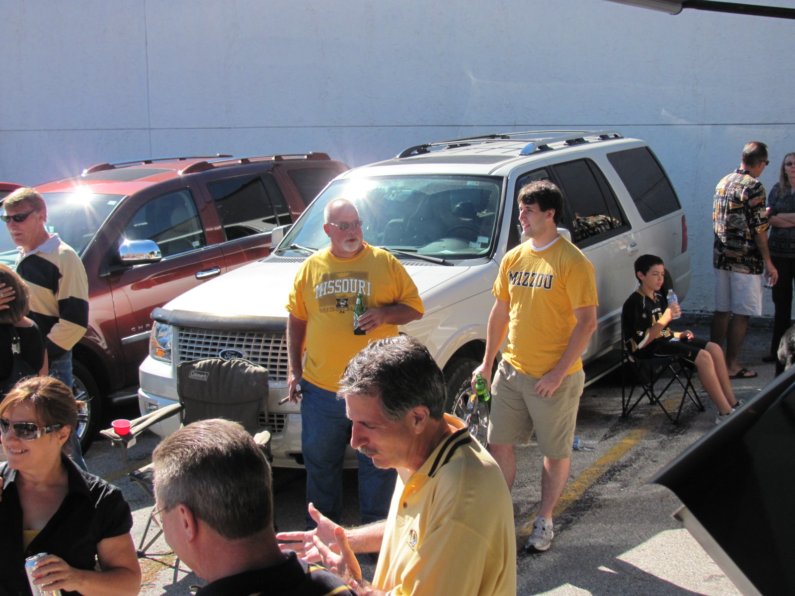 lowing week found us visiting our friend, Bob, at the San Bar Tavern in Russ’ old neighborhood, Angelo and Carmen at Lombardo’s while enjoying one of their yummy pizzas, and Steve coming over to help Russ with an oil and filter change on the RV’s generator. Then the next couple of days were spent coordinating and preparing for the 4th annual tailgate party to be held prior to and after the Missouri/Illinois football game on Sat., Sept. 4, in downtown St. Louis. The first year there were only about 15 in attendance, but it has grown over the years with about 40 this year. The day before the big game I cooked up 5 lbs. of potatoes for my special homemade potato salad, made 60 deviled eggs, and 2 big pots of gumbo (all part of the tradition). We had purchased 5 cases of Heineken (tradition!), 2 cases of soda, a case of water, 4 bottles of wine, 30 Italian sausages, 18 brats, all the condiments to go with the