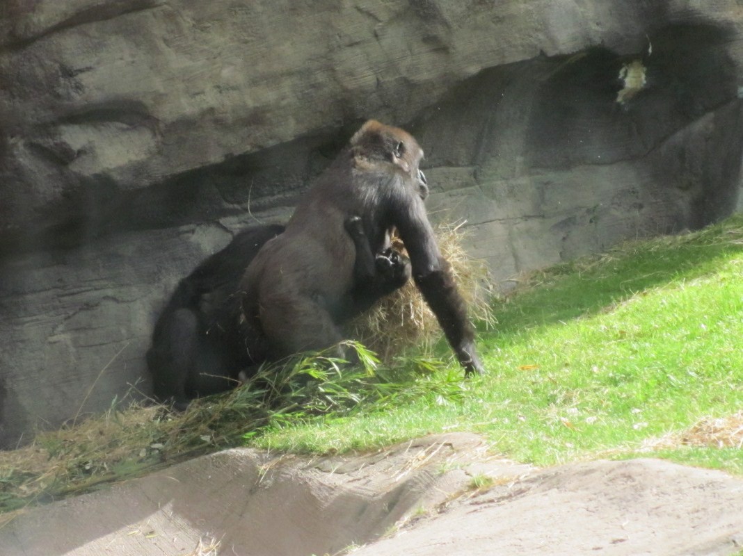 , you may see a couple of them near the large observation window at one end of the enclosure, or you’ll see several of them along the trail out in the open brush. Last year right up against the window we saw the newest member of this Lowland Gorilla family, little 8-week old Lilly. We hoped to see her this year, and