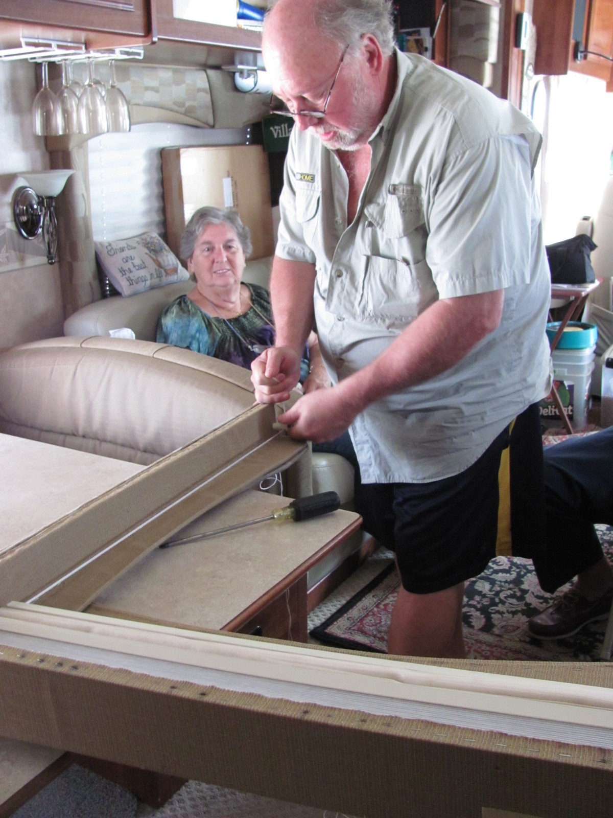 quires a learning process. Most of our windows have day/night shades, and once the string begins to wear (and eventually break), they don’t work so good. We had one repaired last year through a local camping store that cost us $40 just to have some guy restring it. Now we had 3 more in need of repair, and I had been researching on the internet hoping we could do it ourselves. Last week when Paul and Anne stopped by, we discovered that they had ordered a kit to try and repair one of theirs. We made plans to come by their place Sun. so we could see how it’s done. The kit had come with a learning CD, some grommets, and the required string all for $15. Paul had watched the CD before we arrived so he was ready to begin the repair when we arrived. As it turns out, it’s a much simpler process than any of us had imagined. Theirs was only a 2-string shade, and though we had one of those, we also had two 4-string shades which are a little more involved but as it turns out, not much. We borrowed their CD and went in search of the correct string. We found some masonry string at Lowe’s that we were assured by one of th