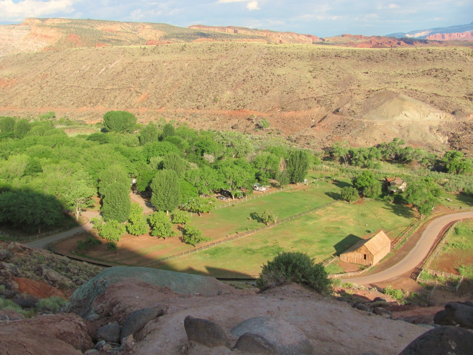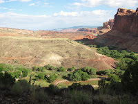 oto above left.) Now you know why it’s often referred to as an “oasis in the desert”. The views were magnificent, and I felt as if I was seeing an overview of the center of Capitol Reef. I was tempted to go further but thought better of it…perhaps next year. As I made my way back down, I spied Russ and Abby waiting for me, and I zoomed in for a photo as Russ waved. This had been a lovely, peaceful way to start the day.