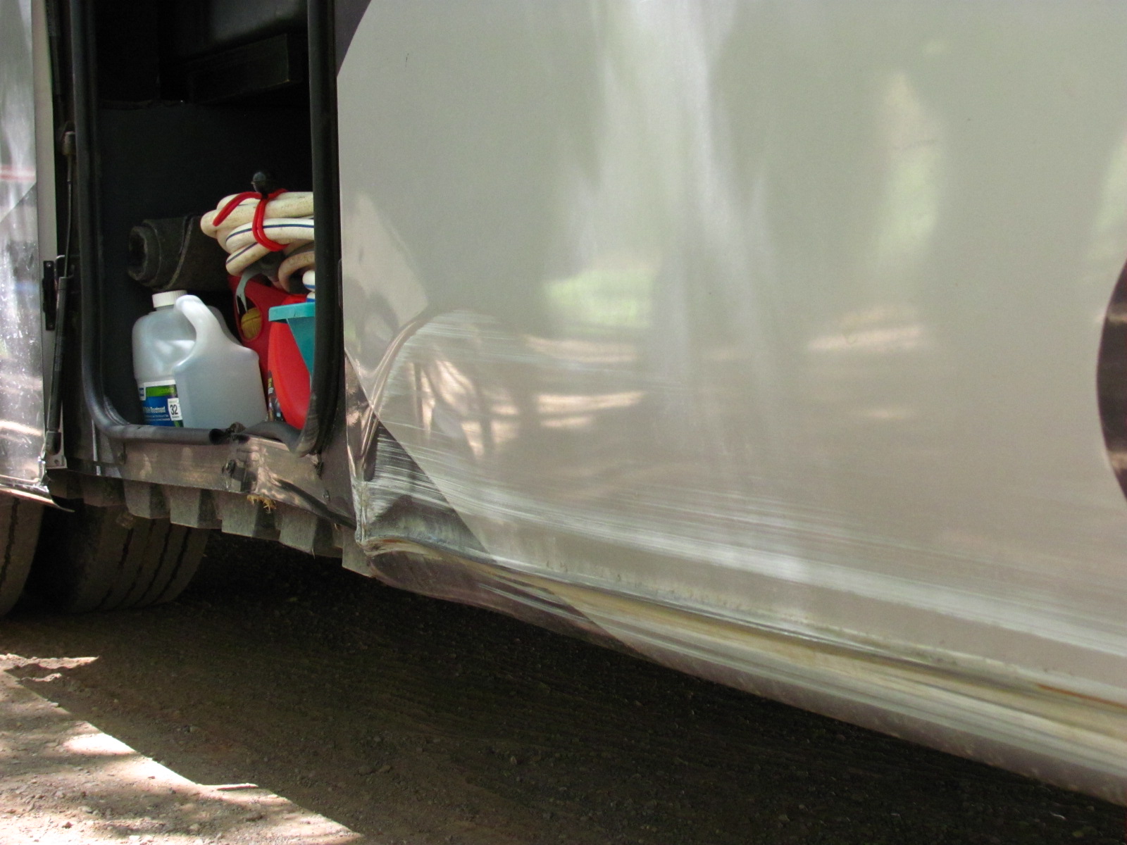 We were ready to depart and the road construction that had been ongoing since we arrived had recently begun just outside the campground. A few days earlier when they had dug up the existing asphalt, they had damaged a section of a historical sewer system put in by the Mormons so there was now a large area cut out with about a 3 foot dropoff. The crew had compacted some dirt on one side of the road so the pilot car could still lead people out, but things didn’t work out so well for us…we had a little accident. One of the basement doors had to be totally removed and there was damage to two others. We were fine, but this was going to make a slight change in our travel plans.