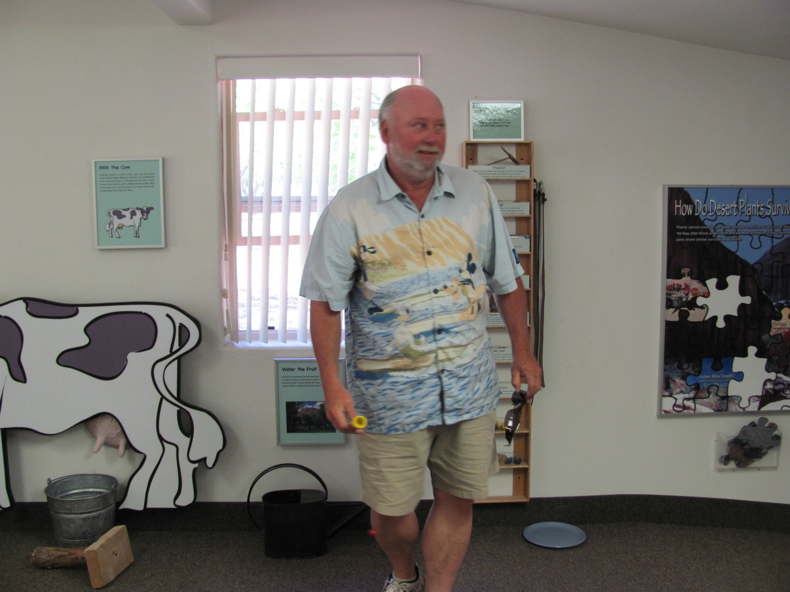 and geology of the area. Open afternoons, five days a week, kids can grind corn like the Fremont Indians, dress up in clothing as worn by the settlers, pretend to milk a cow, play some of the games kids back then would have played, and so much more. Russ tried his hand at flipping the ball into the little cup, which takes more coordination than you might think but he did it!