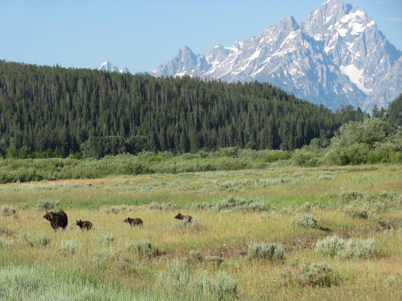 We moved to Colter Bay Campground more centrally located within the park, and the next night we had the thrill of seeing this mama grizzly and her 3 cubs wandering through the sage not very far from the road. We were required to stay in our car as she made her way across the Willow Flats towards the road where they crossed to get to the trees on the other side. What an incredible sight!
