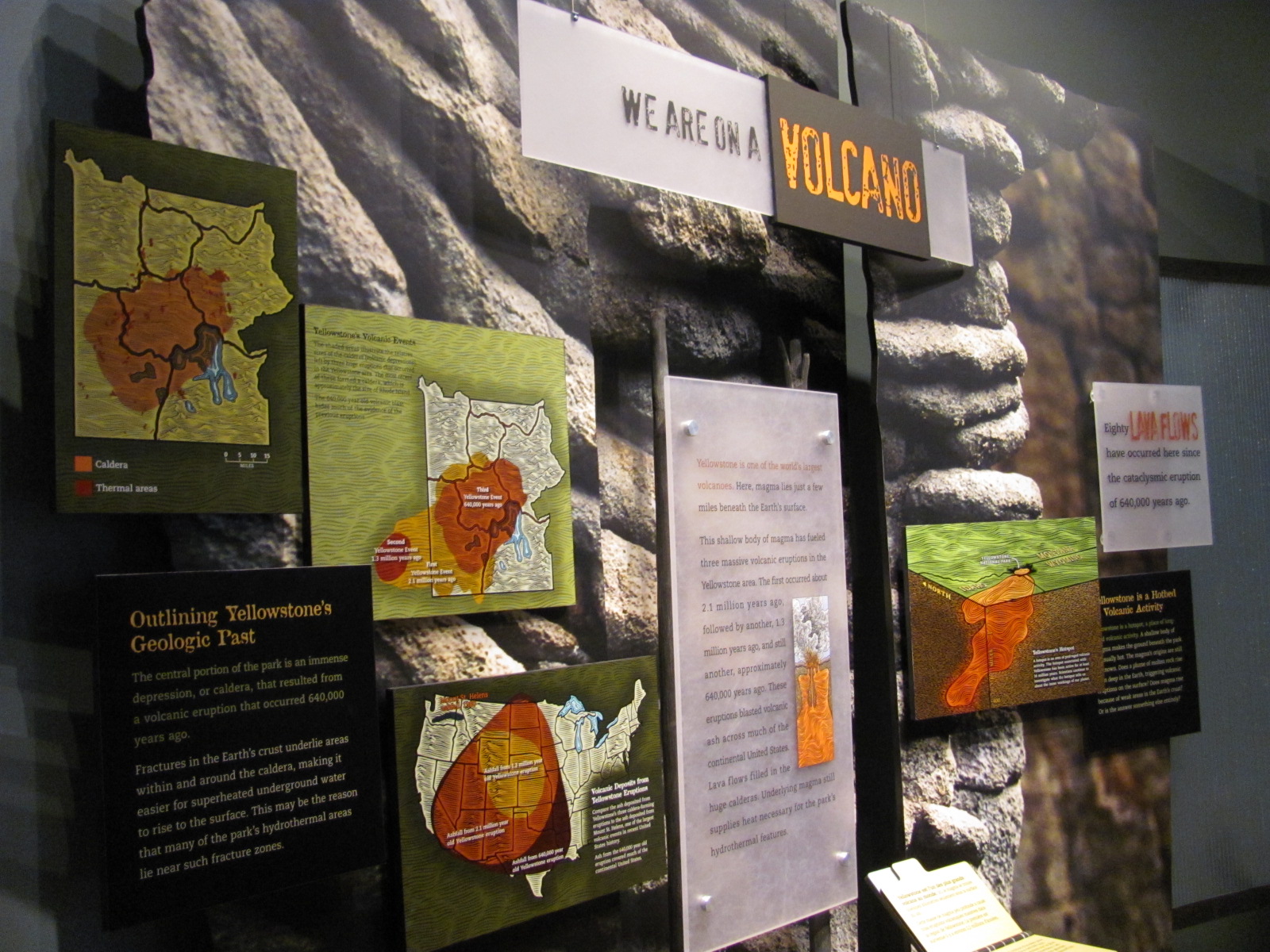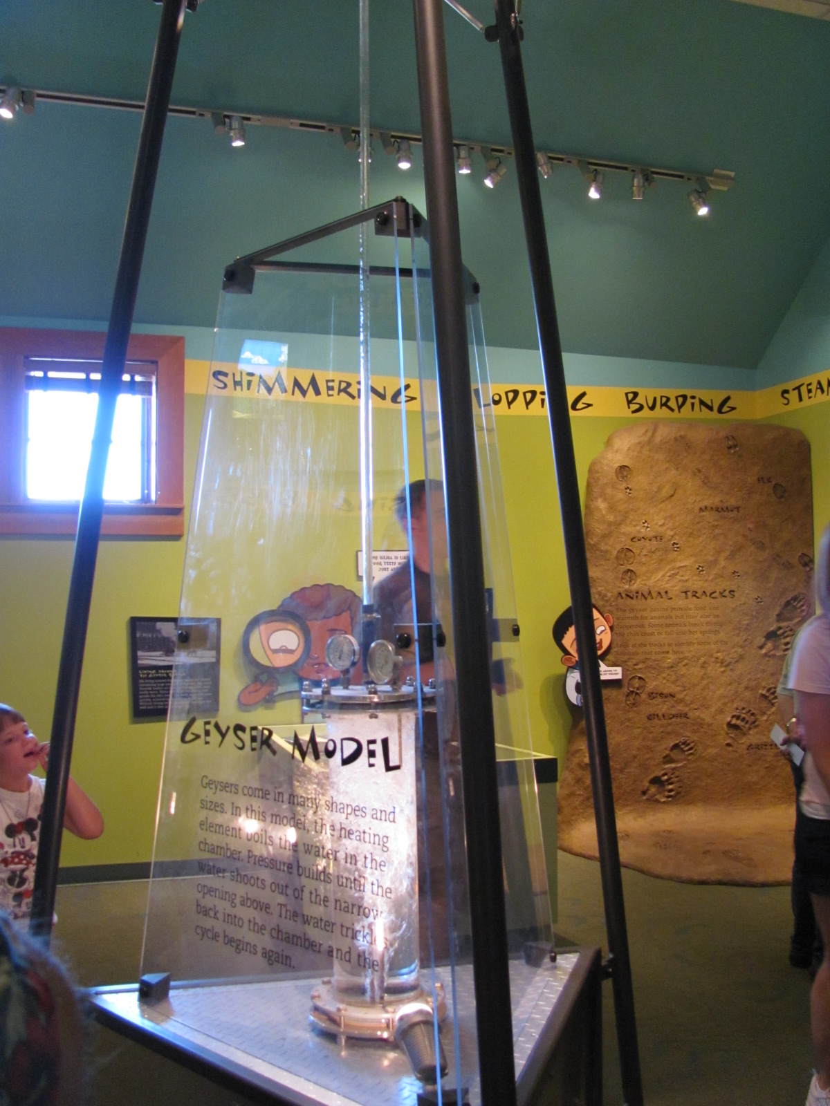 a 15 minute film on Yellowstone, but overall we were a little under whelmed with this $27 million eco-friendly facility. It seems like there is a lot of wasted space in spite of the 4,500 square foot exhibition hall which has lots of displays explaining the hydrothermal features, the volcanic geology and history, and life in extreme environments but not a lot of interactive exhibits. The “Young Scientist” section, which is geared towards kids, does have a mechanical glass model of how a geyser works which is pretty cool. Water boils, builds up pressure, is pushed up through a constricted pipe, and then erupts into a dome covered near the ceiling.