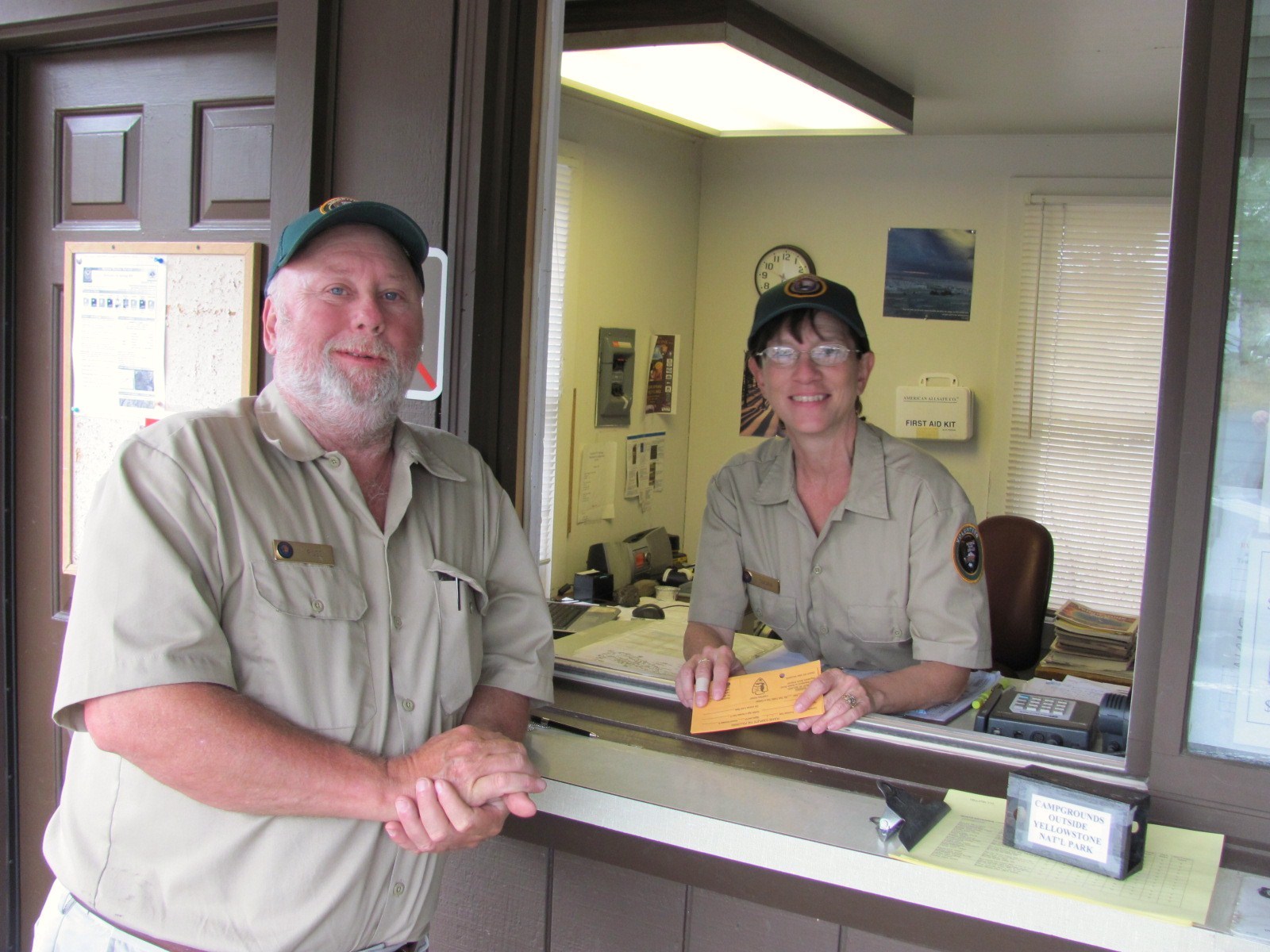On our second day at Mammoth Campground we ran into hosts Jim and Kay who we had met last year, and who had been our inspiration to venture into the world of campground hosting. We chatted for a bit with them mentioning that they were short one set of hosts because of a family emergency and wondered if we’d be interested in filling in for a month. Hmmmm, hosting at Yellowstone?? Oh, yeah!! It was something we had talked about doing but knew that the list of people who wanted to volunteer at Yellowstone was quite long. This sounded like a terrific opportunity to get our foot in the door plus we could stay in the campground longer than the 14 day limit and for free! We immediately went back to the RV, typed up an introductory letter to Ranger Allan who was in charge of the campground, and hoped we’d hear from him in a few days. However, the next morning he stopped by our site, gave us some paperwork to fill out, info about the job, and said