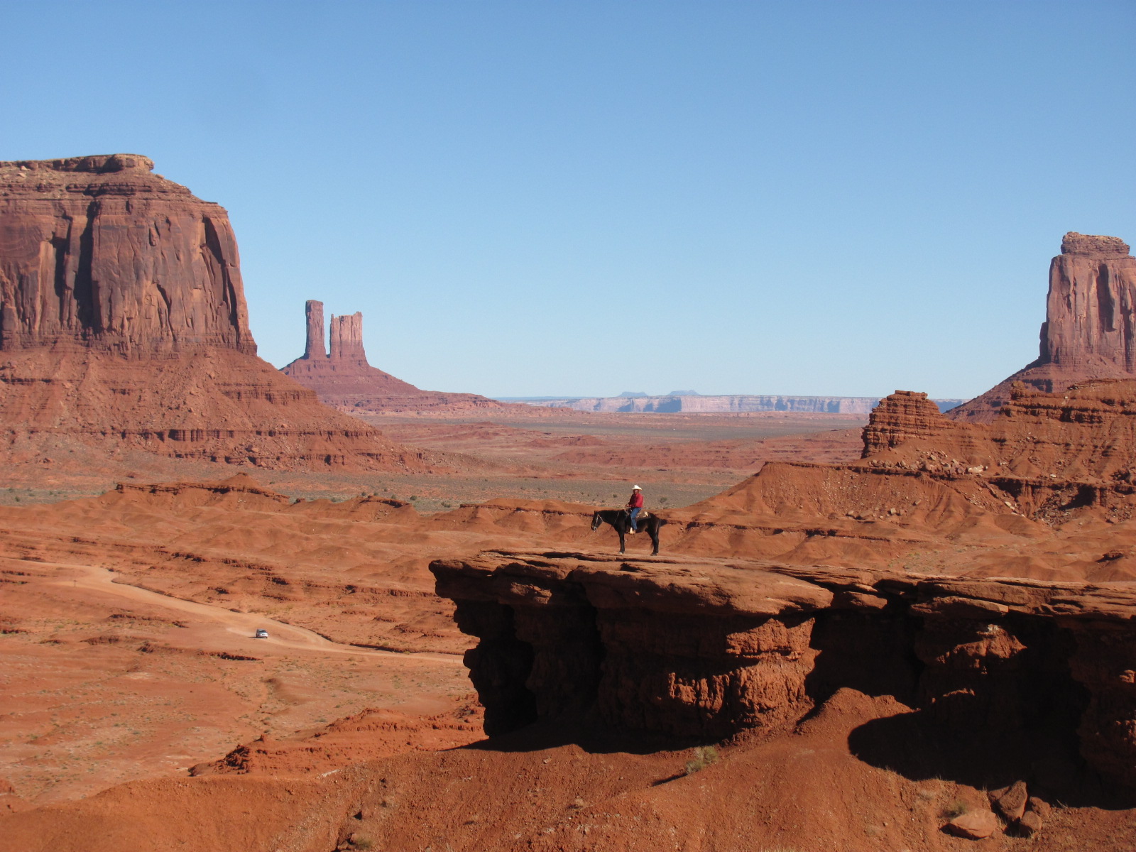 st Mitten Buttes, The Three Sisters, The Thumb, Totem Pole, and Elephant Butte just to name a few. Just as we (and several of the guided tours) arrived at John Ford’s Point, a Navajo man on horseback rode out to the point and posed in typical John Wayne fashion as everyone snapped photos. Quite an impressive sight! Eviden