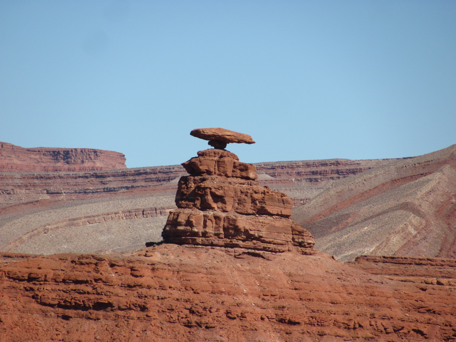 We decided to treat ourselves to breakfast before heading to Monument Valley, and figured there’d be some sort of diner in the nearby town of Mexican Hat. It’s a small village of about 88 people that gets its name from the nearby rock formation that resembles a sombrero or Mexican hat. This rock is about 60 ft. in diameter and sits on top of a much smaller rock on top of a hill. Near the edge of town we found a place called The Old Bridg