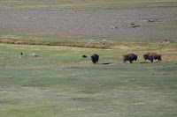 coyotes (seen left).  But it was 3 against 1 and soon the coyotes were chasing the wolf (below right), and eventually even one of the bison joined in the chase (below left)!  Once the wolf was well out of the way, the coyotes