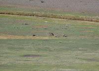 As we continued our drive, once again we had to stop as a critter ran across the road in front of us.  At first we thought it was a wolf, but eventually based mainly on its coloring realized it was a coyote and though quite healthy, wasn't quite as big as a wolf.  We were able to pull over and watch as it scampered up and over the hill.