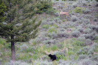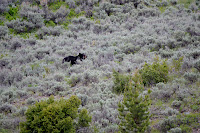 Most of our wildlife sightings are positive and exciting, but on occasion something happens to remind us of the circle of life.  On one such day we headed out to Lamar Valley very early in the morning and were fortunate to see a bull moose, some sheep, mountain goats, the osprey sitting on her nest, coyote pups, and of course bison with their calves.  We always take our park radio with us, and as we were making our way back, we heard a dispatch that a black bear had been spotted near the Roosevelt Lodge.  We