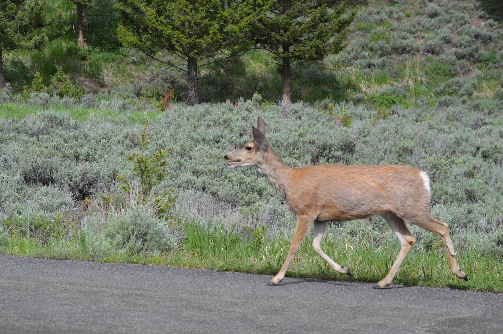 weren’t far away, and as we entered under the Roosevelt Lodge sign, immediately to our right we spotted a mule deer doe with her two young fawns.  I was able to get several shots as they seemed to almost pose on the side of the hill, mama ever vigilant.  We continued down the road towards the lodge looking for the bear but couldn’t see it so decided to leave.