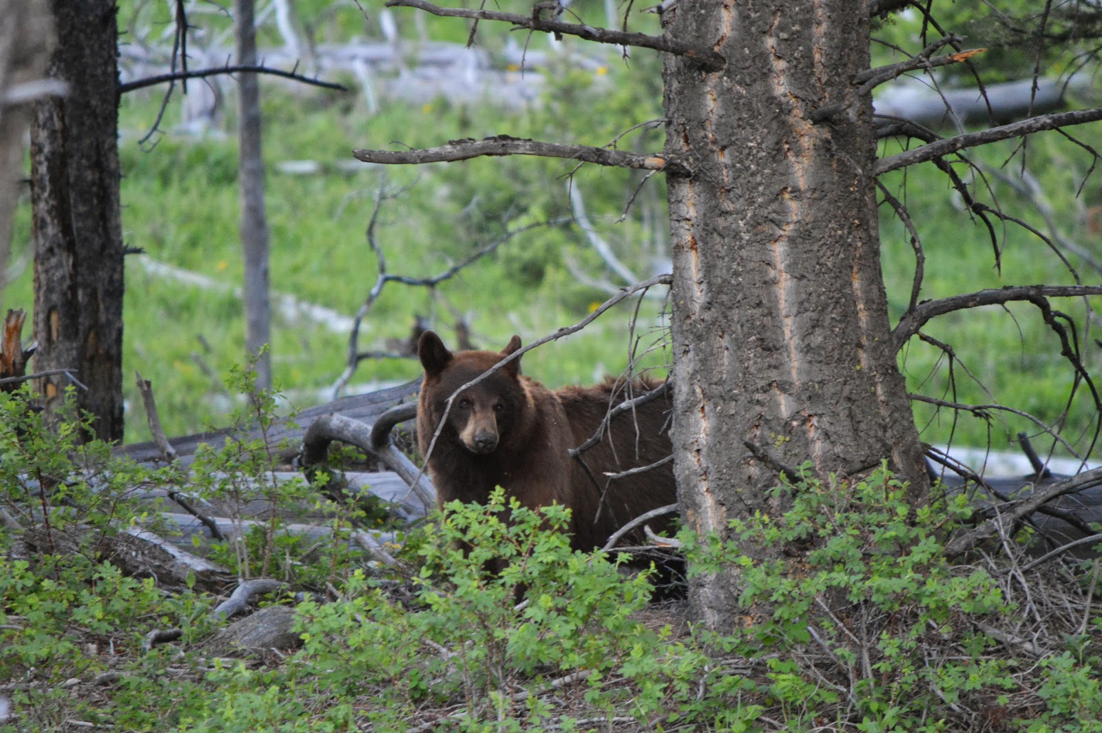 colored cubs!  They were down in the meadow, all of us a safe distance away, watching as they grazed and eventually they wandered off crossing over and climbing on the fallen trees.