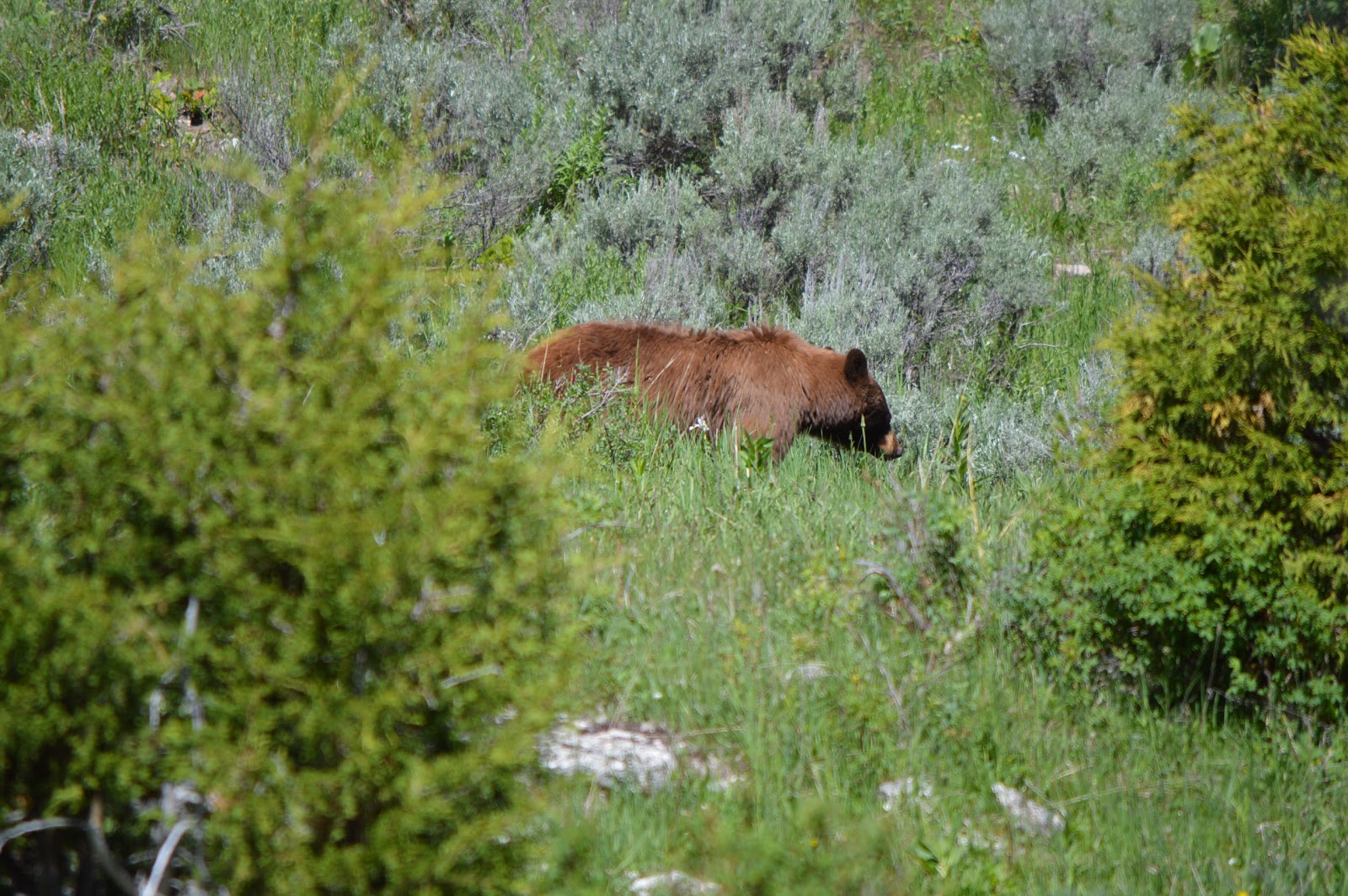 Early one morning we were heading towards Lamar Valley, and a few miles before the Tower-Roosevelt Junction, we spied a black bear on the hillside just above the pullout.  There were only a couple other cars parked, but fortunately no one was getting out of their car because we were much closer than the 100 yard limit.  I stood on the seat, shooting pictures from the sunroof, as we watched this beautiful creature meander and graze along the hillside.