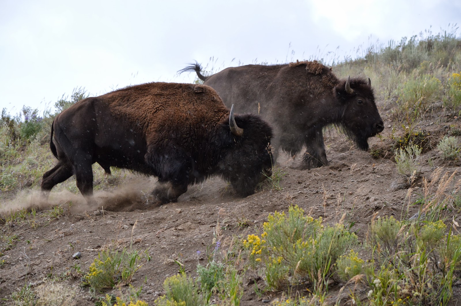 We made a trip out to Lamar Valley to catch some of the bison rut and found this bull doing his best to impress a cow by kicking up as much dust as possible.  Believe it or not this is just one way he displays his strength and vigor to the receptive female.