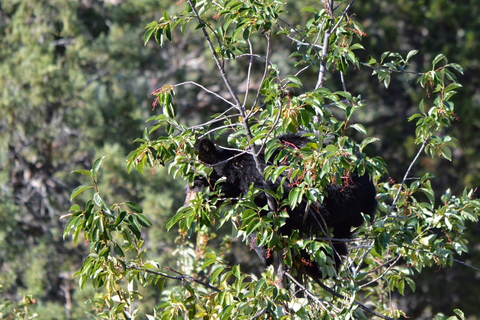 Early one morning while we were working, we had some unexpected campers.  At the far end of the campground, Russ spied a brown black bear sow and her two cubs…one black, one brown.  He radioed me so I could radio the Communications Center for assistance in keeping folks the required 100 yards from them.