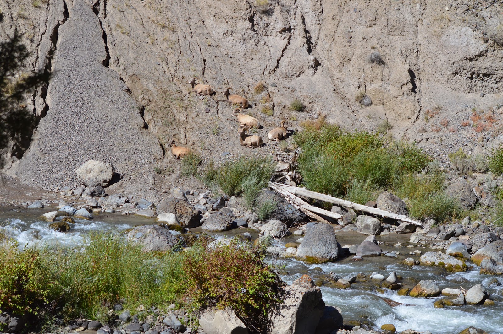 On our way to Gardiner one afternoon, we saw several cars pulled over which meant there must be critters in the area, probably big horn sheep.  We found a spot to park and discovered that there were 6 rams sunning themselves on the opposite river bank.  It was so surprising