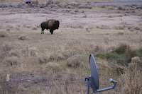 a bison jam.  As you can see from this photo out the front window, we were going nowhere until he moved!  Now some of you may remember that last year we enjoyed an incredible sea scallop dinner with Rich, Annette, Bill, and their friends.  This group has been