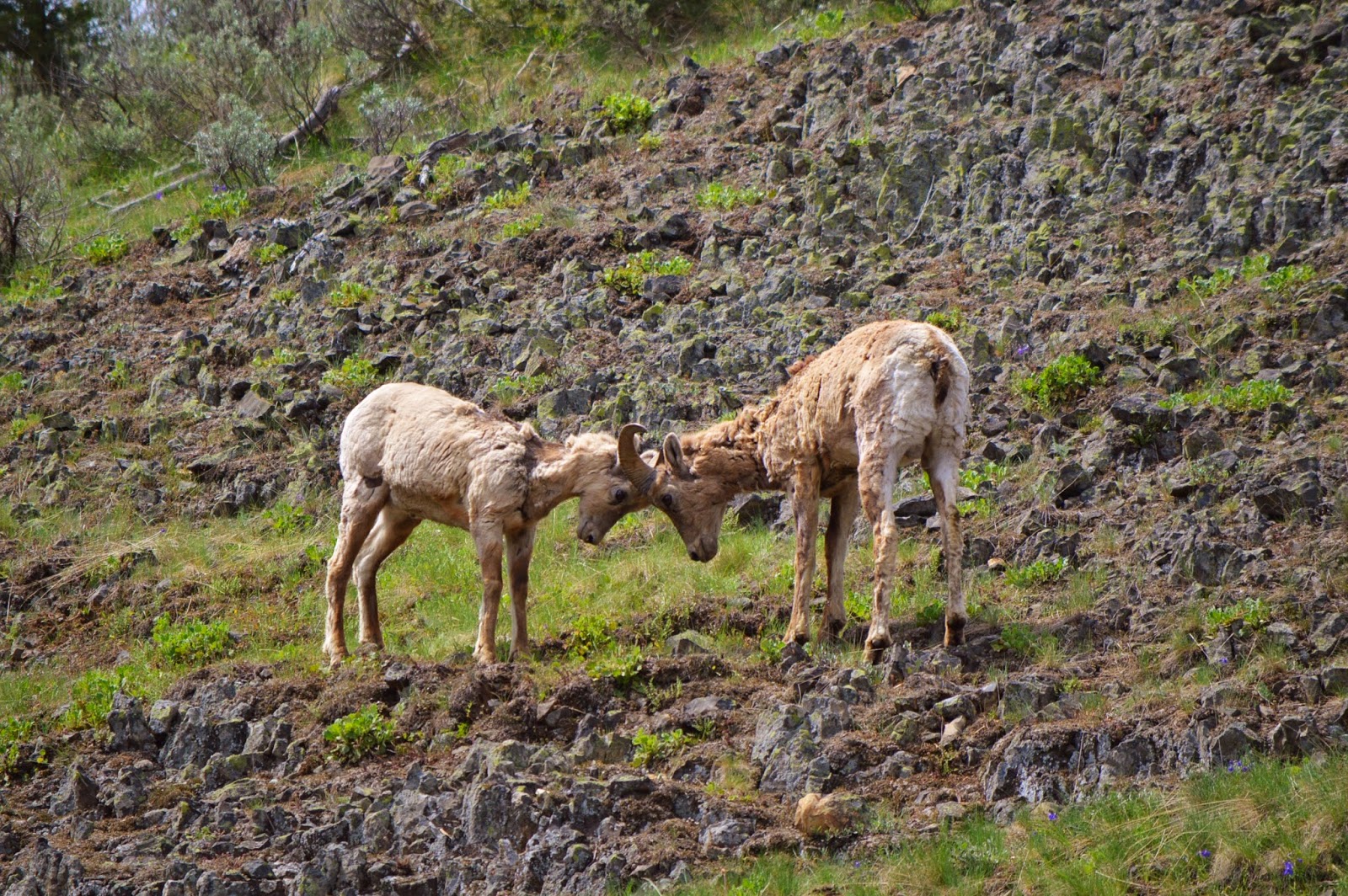 Across from the parking lot for the Calcite Springs overlook one day, we got to watch the antics of a couple of young bighorn sheep rams.  Looks like they were practicing their headbutting for when they get a little older!