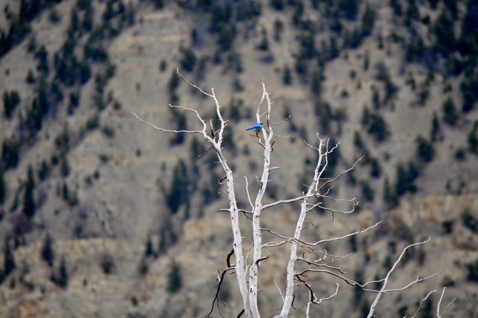 Spotting a mountain bluebird is always a joy.  The male’s brilliant blue color is striking and easily seen, and though we’ve had a few in the campground, it seems I’ve never had the camera handy.  So it was a treat when I was able to snap this guy posing in a tree across from the Mammoth Terraces.  Since the females are less bright and grayer, we weren’t sure if we’d ever seen one but heard there was a mountain bluebird nest on the road to the Slough Creek Campground.  While out that