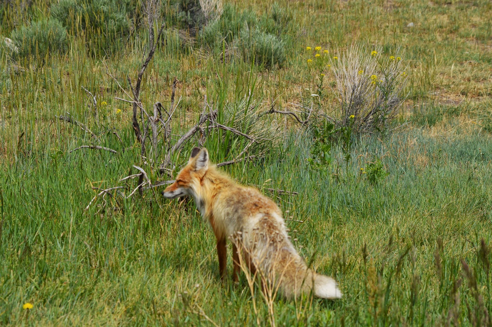 There’s been a fox traveling back and forth through the campground quite a bit this summer.  One afternoon we had driven up into Mammoth with Abby in the car of course, when we spotted the fox