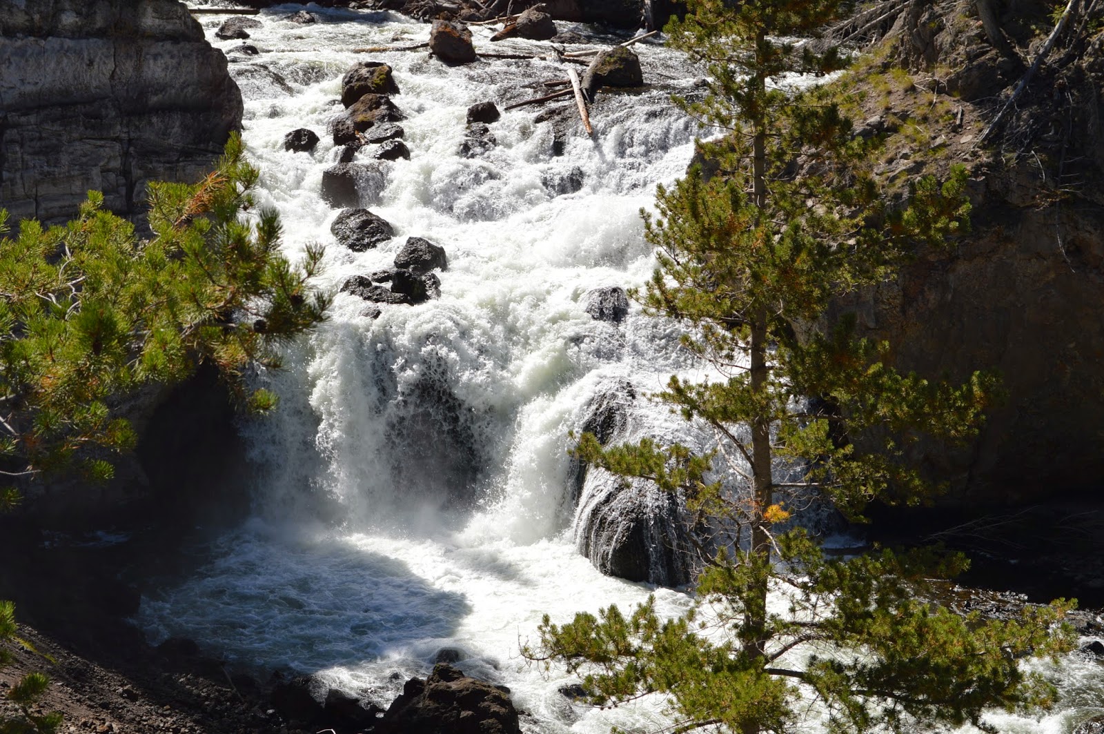 Firehole Canyon Drive is a one-way side road that takes you through the canyon along the Firehole River, past 800 ft. high lava cliffs as well as the Firehole Falls and Cascades.  The area gets its name because it was once covered by bubbling lava as well as the many thermal features surrounding the river that empty into the it creating warm spots throughout.  It's a very popular place with fishermen because of its abundance of trout.  It had been a couple of years since we’d taken this drive, and we always forget how beautiful and fascinating it is.