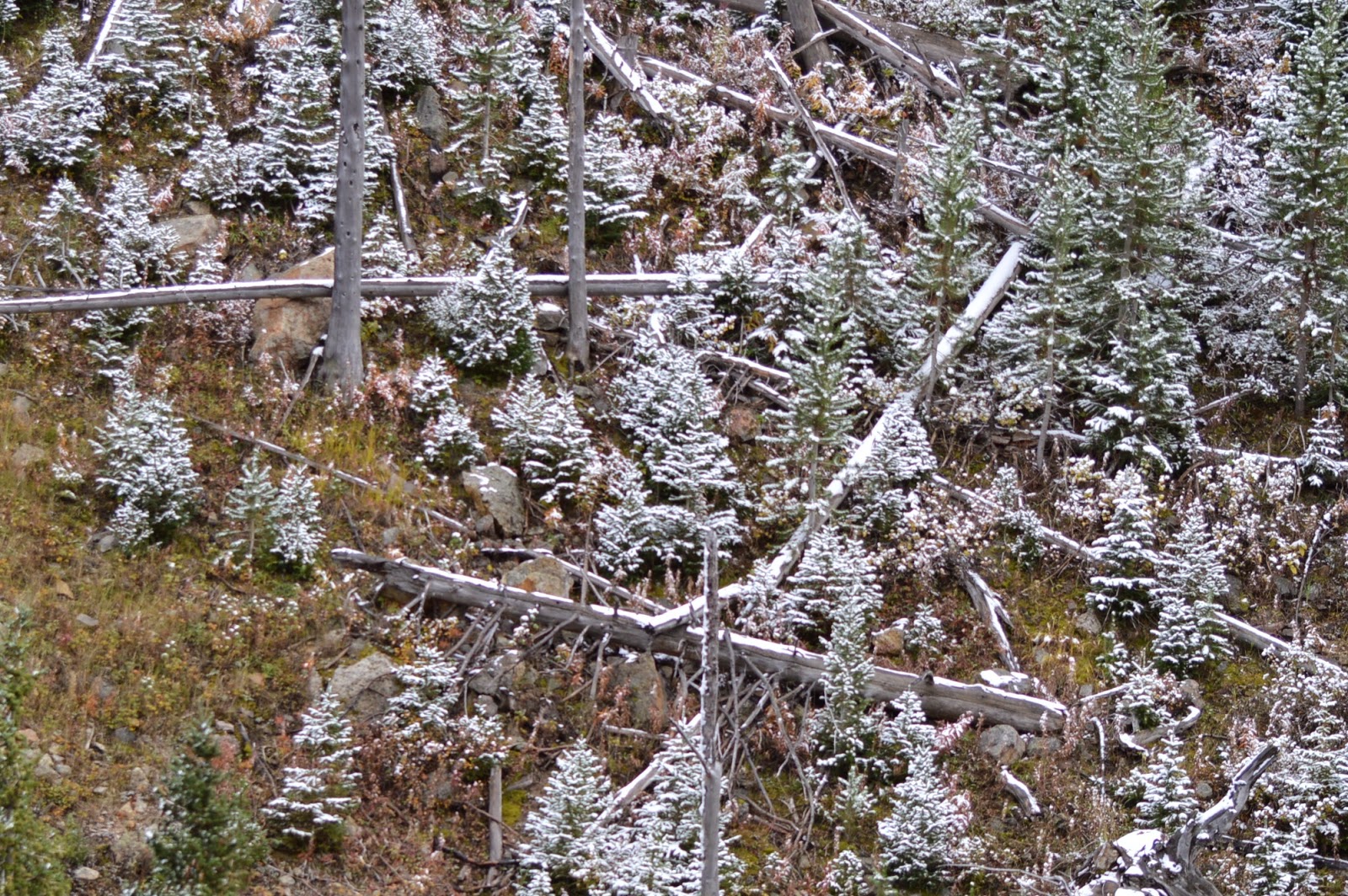 One morning we awoke to a dusting of snow on the hills and mountains but none in the campground.  We took a short drive to see if there was more out on Swan Lake Flats but only saw it on the trees and Bunsen Peak, nothing major in the Mammoth area.  The temperature was