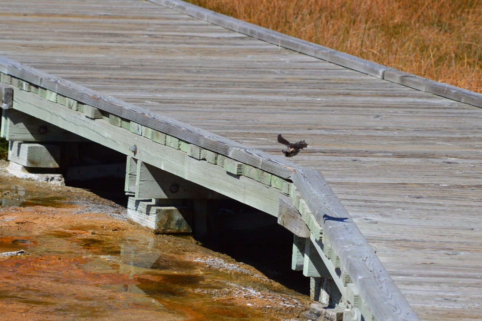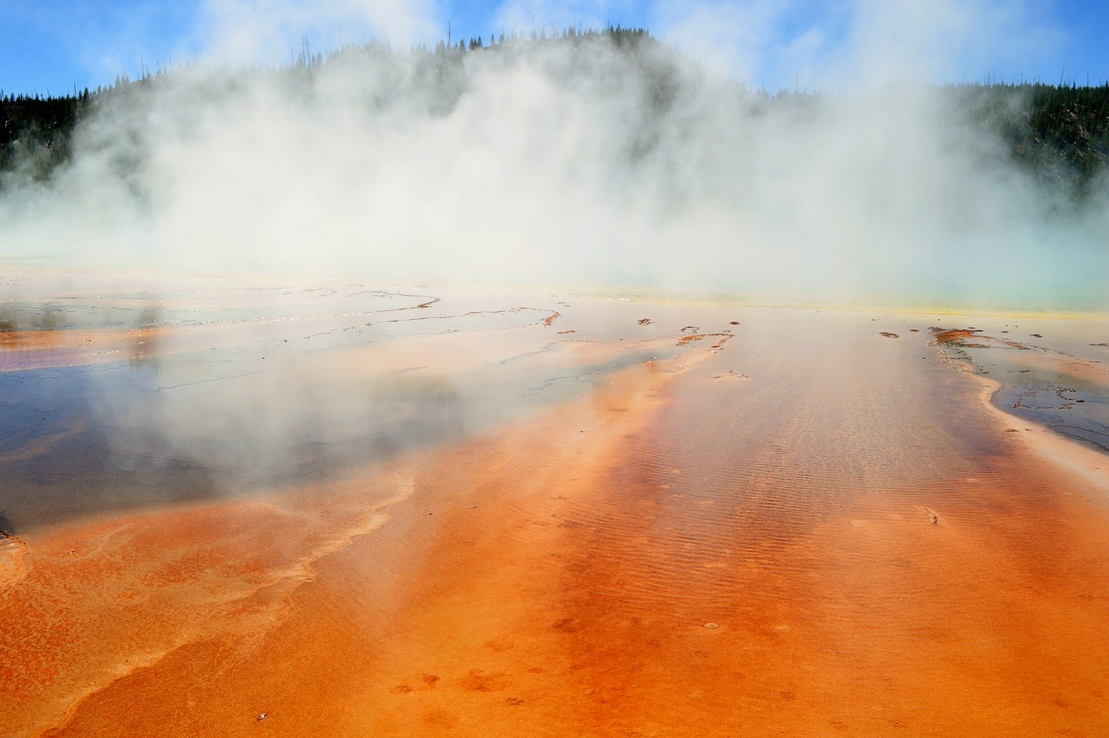 This bright blue spring is 120 ft. deep and gets its name from the colorful bands of yellow, orange, brown, and green algae that surround it.  The runoff channels carry about 500 gallons of hot water per minute to the river, and it looks like a brave critter might have been walking on some of them! (below right)