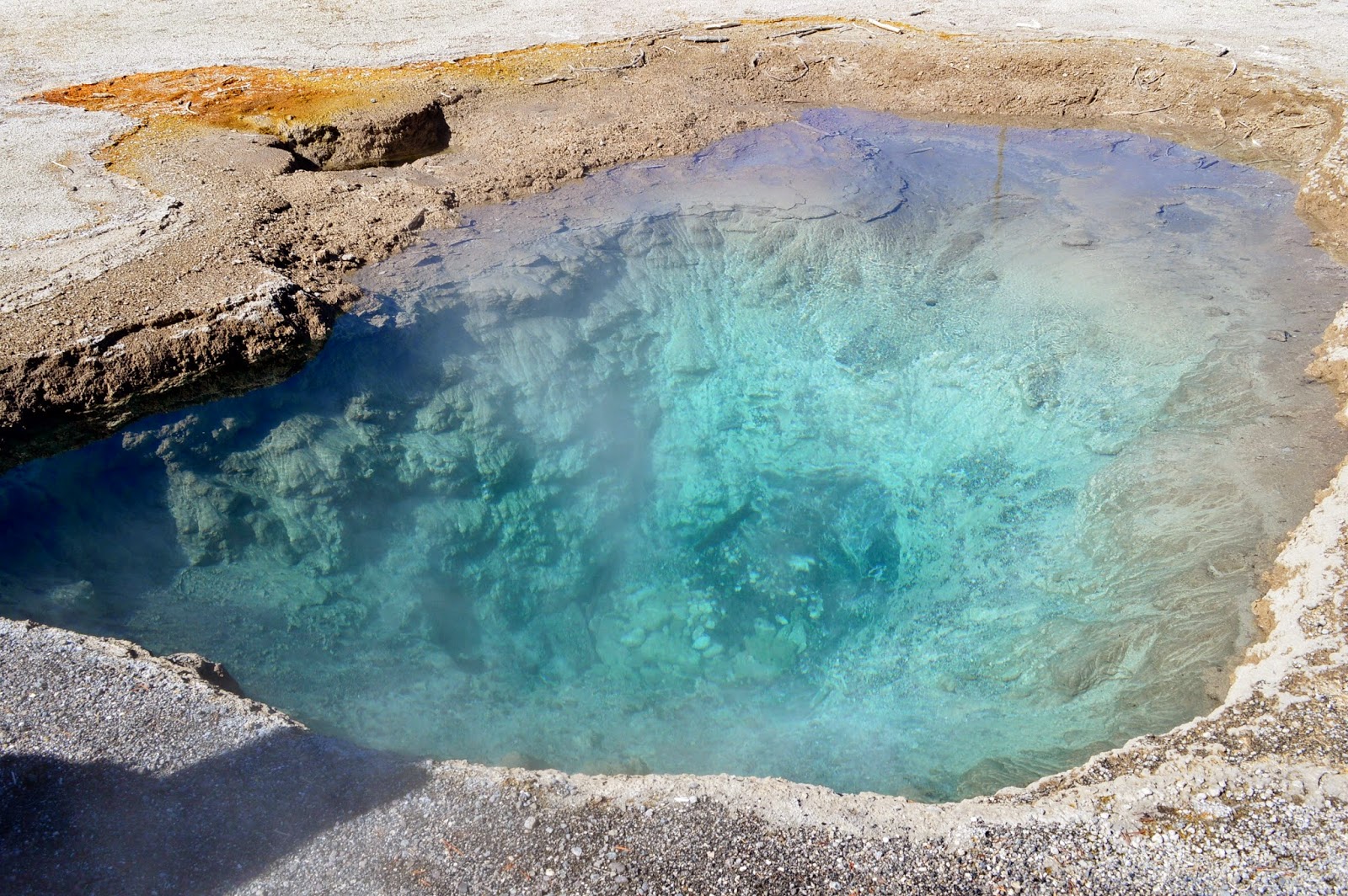 underground system leaving a 300 ft. wide crater.   There have been rare occasions where it has erupted again over the years, but mainly now it is a deep blue pool that pumps more than 4,000 gallons of hot water per minute down its channels into the Firehole River (photo at right).