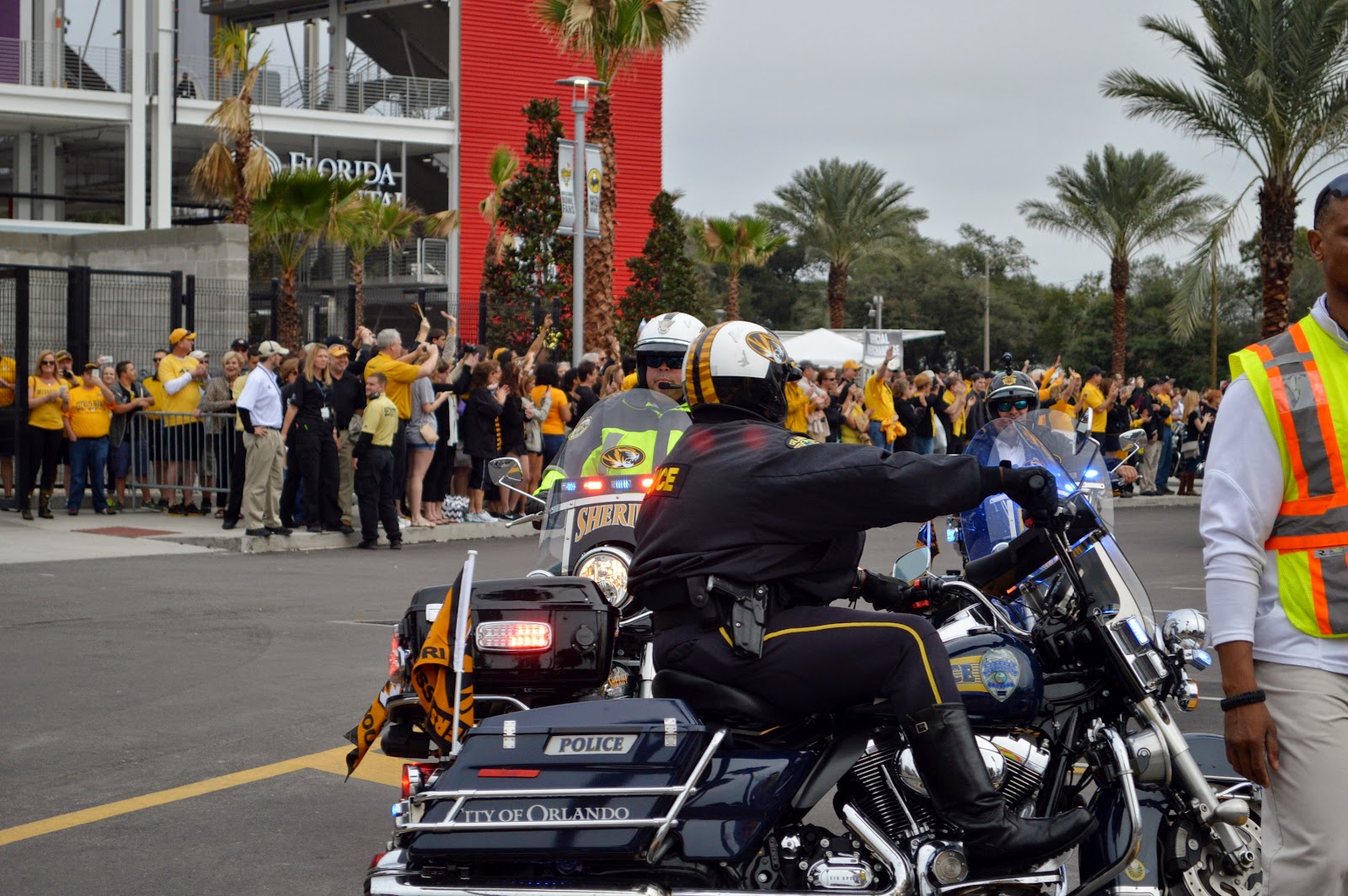 flags on their motorcycles and logos on their helmets, came the rest of the team, and there were plenty of Mizzou fans waiting
