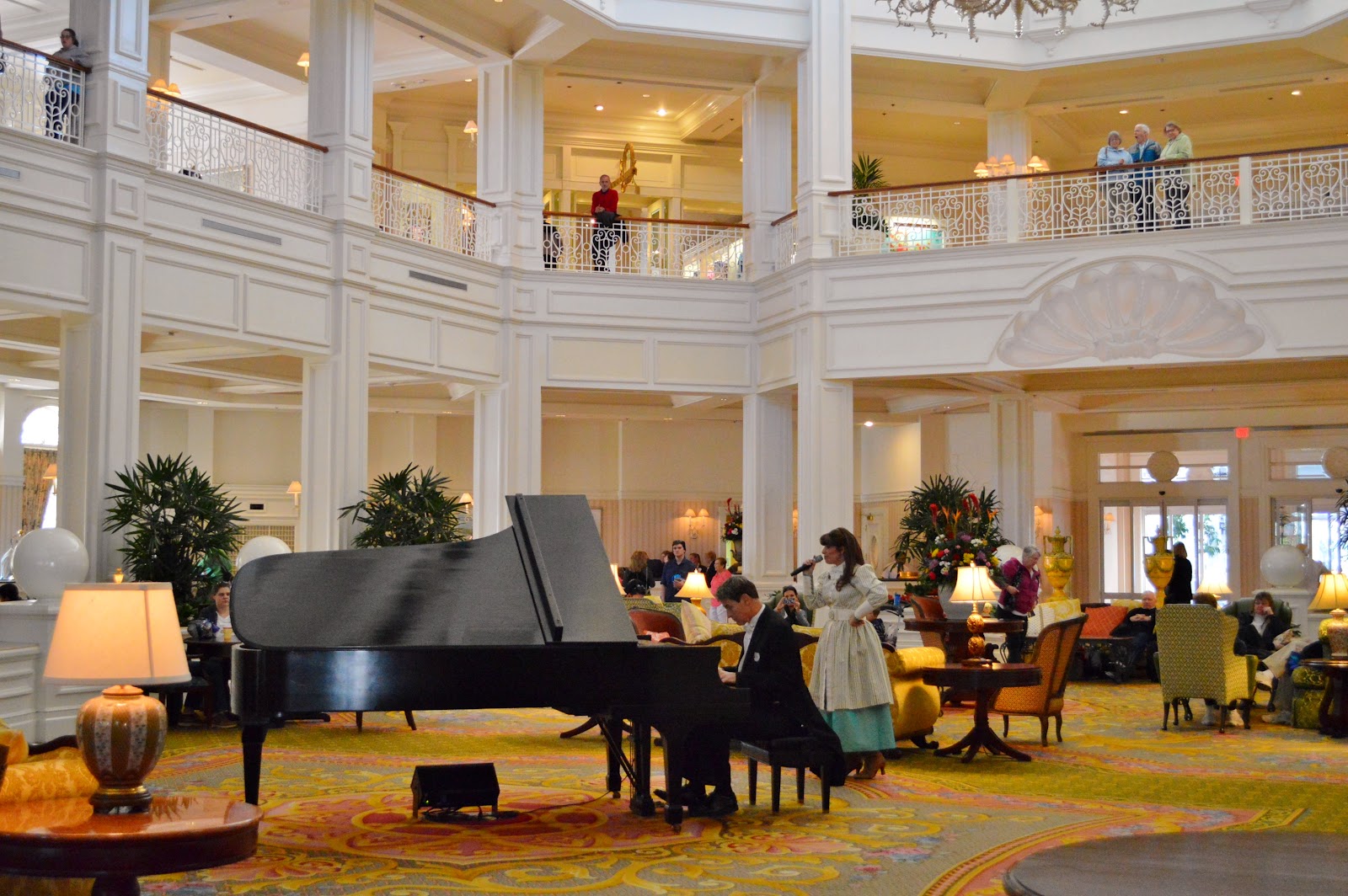 the Grand Floridian Society Orchestra entertains from the 2nd floor balcony. Folks love to come, sit, and listen for