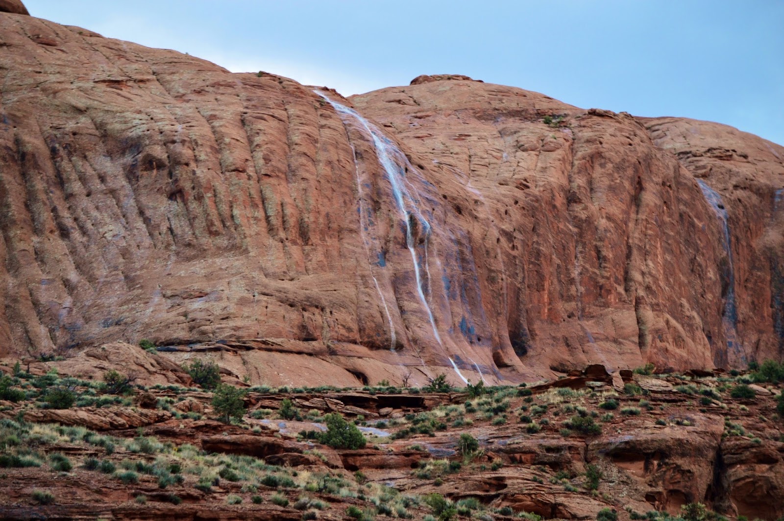 some beautiful waterfalls coming from the red rock cliffs surrounding the