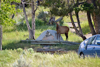 There haven’t been nearly as many elk in the campground this year, but this young lady at right seems to have staked out her tent site!  And speaking of elk we finally saw our first elk calves of the season.  One was just inside the north