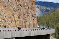 As you know several thousand bison roam the park mostly out in the Lamar and Hayden Valleys (yep, all those dots in the photo at left are bison in Lamar).  But as you also know, at various times througout the year we also get them in our neck of the woods.  One day as we were traveling