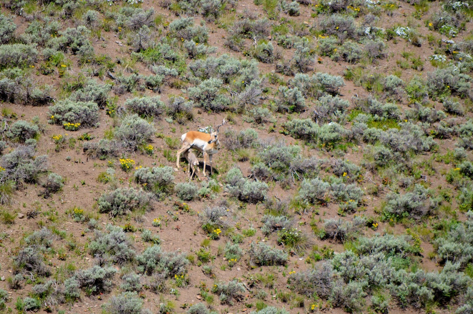 the sage, and if it hadn’t been for those folks, we probably would have totally missed it figuring it was just another pronghorn on a hillside.  Pronghorn generally have twins, and one couple said that there was another one bedded down in the sage out of sight. We watched for awhile, and I almost couldn’t get enough watching this young one trying to keep up with mom, figuring out how to use those legs.
