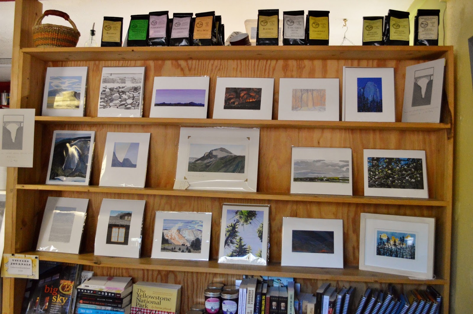 One of our seasonal rangers is a talented artist and recently held an art show at the Tumbleweed Café in Gardiner.  Mary Ellen (that’s her in the blue dress) has a B.F.A. in painting and printmaking, and her work has been shown nationally.  She’s currently an artist-in-residence here in Yellowstone, and