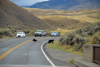 During the summer bears head to higher elevations where it’s cooler but were now starting to head back down.  One day just 2 miles down the road as we were heading to the north entrance, this black bear sow and her cub suddenly ran across the road and fortunately I had my camera with me!